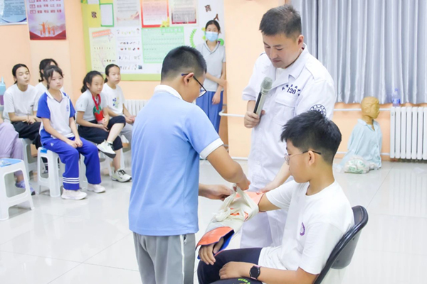学生在急救医生杨海俊指导下体验外伤后包扎与固定方法