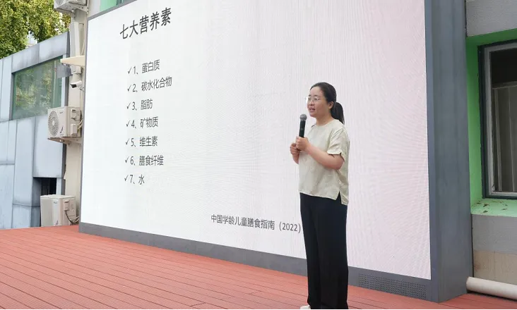 讲座中,江倩通过图文并茂的PPT展示,将复杂的营养知识变得简单易懂。她详细讲解了蛋白质、碳水化合物、脂肪、矿物质、维生素、膳食纤维、水等七大营养素的作用,以及如何通过合理搭配食物来确保营养均衡,用亲切的话语和生动的例子,向小朋友们介绍了人体所需的各类营养素及其重要性。同时,江倩还针对小学生常见的挑食、偏食等问题,提出了科学的建议和解决方案,尤其对于肥胖的小朋友,鼓励他们多吃蔬菜水果,少吃零食和油炸食品,培养良好的饮食习惯。