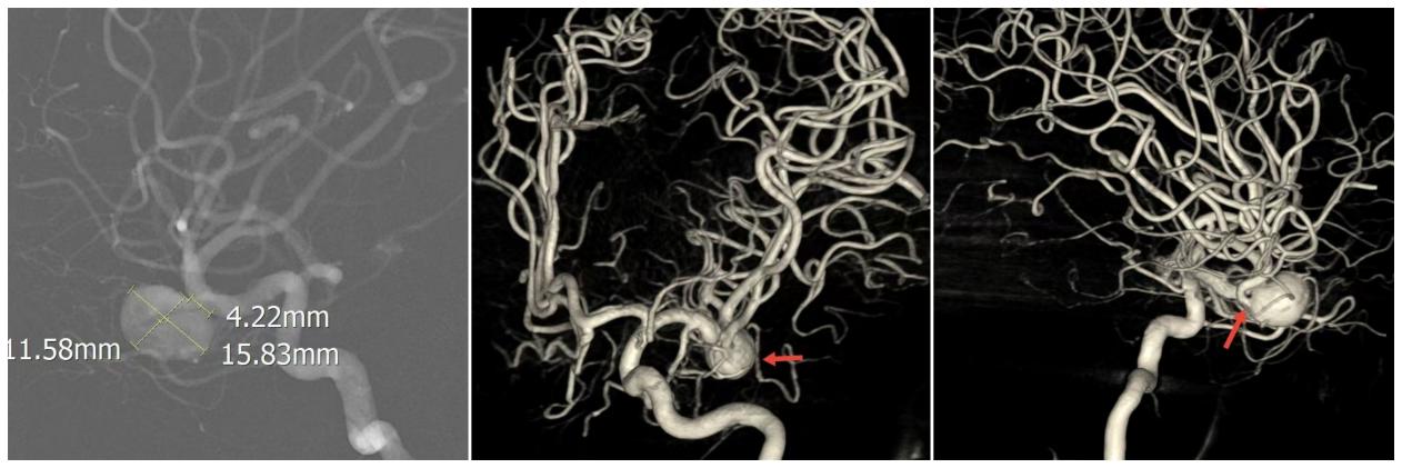 ▲动脉瘤位于右侧大脑中动脉M1段分叉处,椭圆形,大小约15.8*11.6mm,瘤颈宽约4.2mm,下干自动脉瘤上发出。