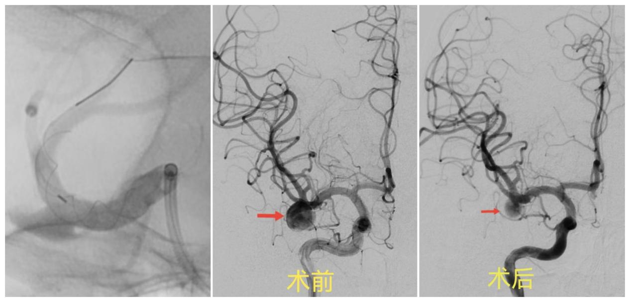 ▲密网支架打开形态良好,贴壁满意,术后即刻造影见动脉瘤内造影剂滞留,体积明显缩小,且下干血流通畅。