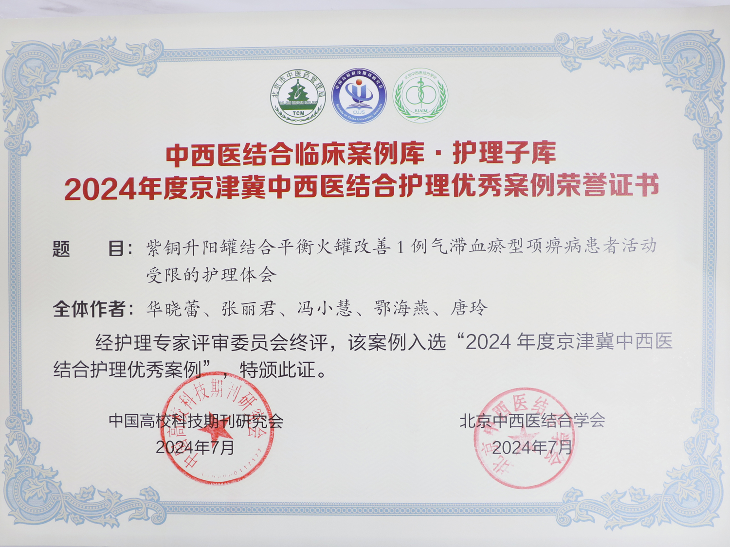 经过专家遴选,华晓蕾撰写的《紫铜升阳罐结合平衡火罐改善1例气滞血瘀型项痹病患者活动受限的护理体会》再一次从优秀案例中脱颖而出,获得北京中西医结合学会“上工杯”学术活动京津冀中西医结合护理案例大赛三等奖。