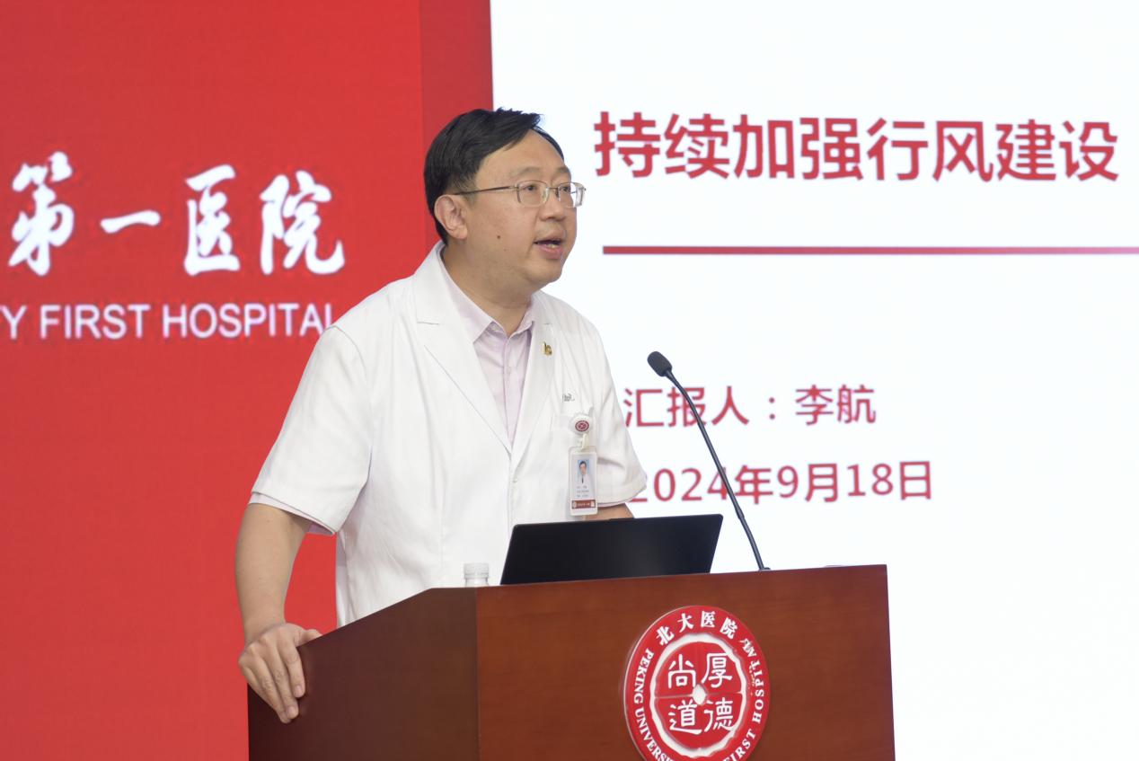 副院长李航进行《持续加强行业作风建设,促进医院高质量发展》专题发言。李航副院长从国家层面行风建设政策制度、医院层面行风建设工作机制、存在的问题和取得的成果等方面进行了诠释和总结,要求全院干部职工切实加强医疗行业作风建设、优化服务流程、构建“亲”“清”的医商关系以及和谐的医患关系,用好国考指挥棒,赋能医院高质量发展。