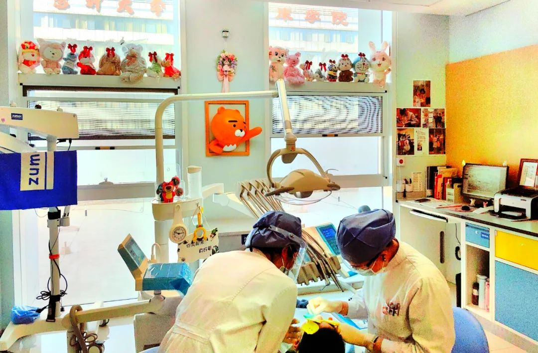 李欢医生(右)的口腔诊室,摆放着孩子们喜欢的卡通玩偶