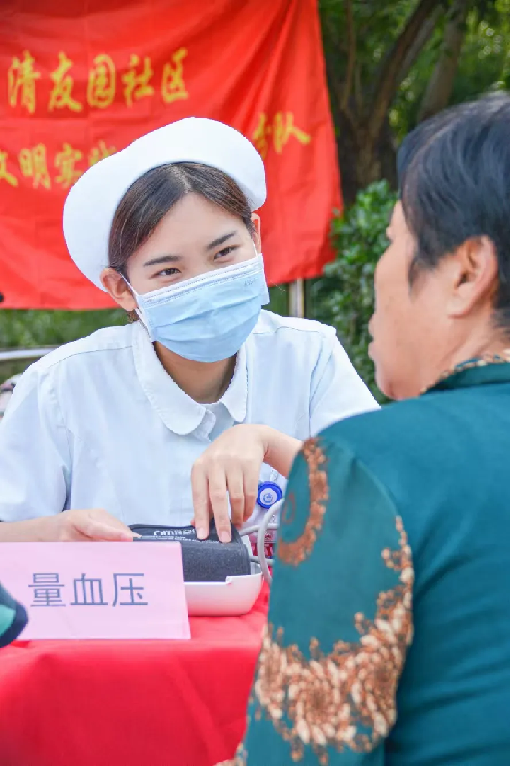 门诊办公室史叶叶主管护师、十一病区黄文慧护士为居民免费测量血糖和血压,提醒高危居民咨询相关专家。此次活动共服务近150人次,受到社区和居民的一致好评。
