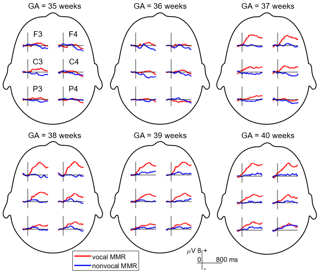 图1.实验结果。图中展示了从刚出生的新生儿头皮采集到的失匹配成分MMR,红线表示情绪材料诱发的MMR,蓝线为对照声音(非语音)诱发的MMR。实验共纳入35~40周孕龄6组新生儿,每组20人