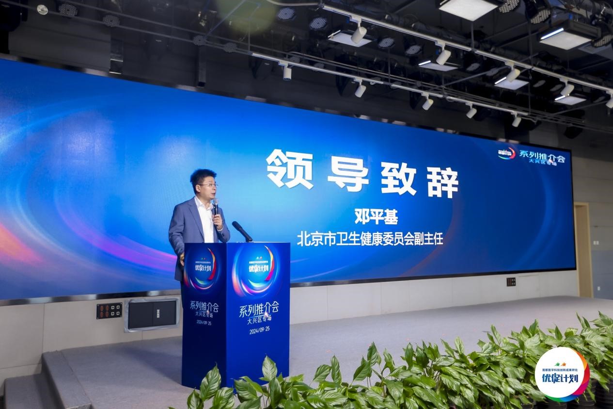 市卫生健康委副主任邓平基发表致辞。他表示,“优促计划”作为首都医学科技创新转化体系建设的重点工作之一,以临床问题和需求为导向,通过“选优”和“促优”两个方面工作,建设医学科技创新转化生态体系。目前,“优促计划”的品牌效应已经显现,社会影响力也逐渐增加,初步实现了“6个1”的任务目标,取得了显著成绩。大兴区是北京市生物医药产业的重要组成部分,在大兴开展“优促计划”推介活动具有重要意义。通过市区两级的协同合作,未来一定能看到更多源自临床的创新项目开花结果、造福群众。