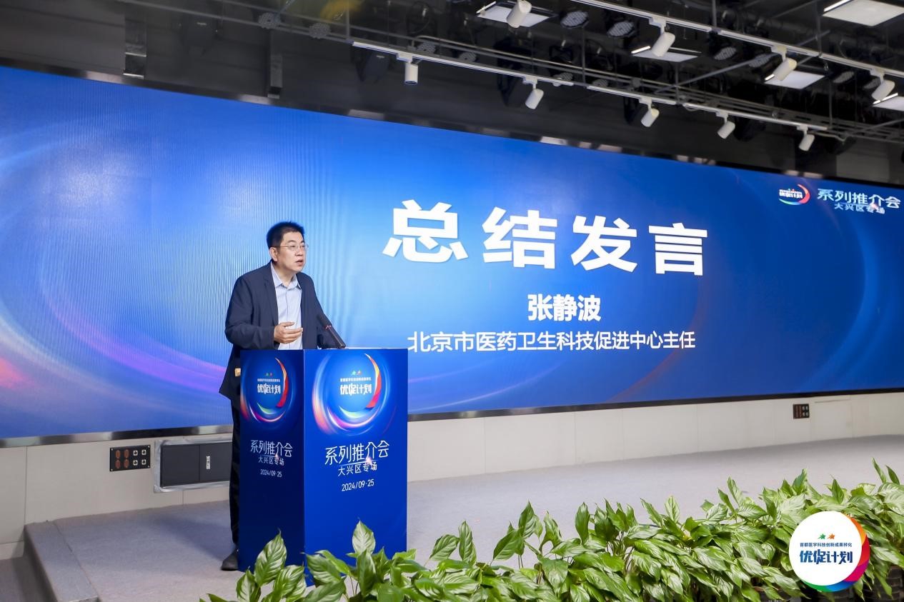 最后,市医药卫生科促中心主任张静波作会议总结。他对本次会议给予大力支持的大兴区政府部门、企业机构和医院同仁表示衷心感谢。他强调,本次推介会的核心目标在于提升参会人员的科学转化意识,通过搭建平台、分享经验,构建更加高效的科技成果转化机制。他呼吁与会各方积极建言献策,携手 “优促计划”共同探索出一条适合首都医学科技创新发展的新路径,帮助更多来自临床的医学创新产品转化落地,更好地造福民生。