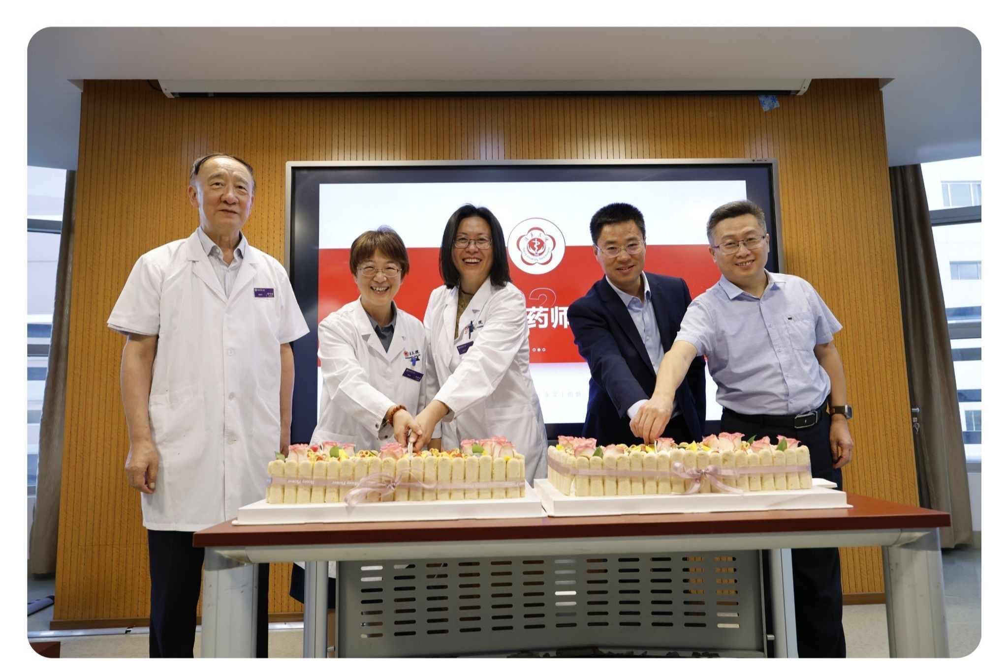 活动中,北京大学第三医院院领导与药学部核心成员共同为药师们切下象征荣誉与祝福的蛋糕。分工会主席江华代表科室将科徽发给职工代表及研究生代表。