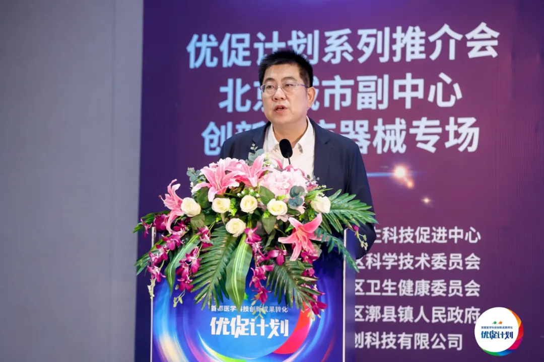 市医药卫生科促中心主任张静波发表致辞。他表示,“优促计划”自启动以来,始终坚持公平、公正、公开的原则,致力于评选出具有创新性和实用价值的医学优质项目,通过有组织的科研和有组织的转化,构建高效、协同的医学科技创新转化生态系统。通州区作为北京市的副中心,拥有较好的医药健康产业发展基础和丰富的医疗资源,应该充分发挥副中心的独特优势,积极融入首都医学科技创新转化生态体系。