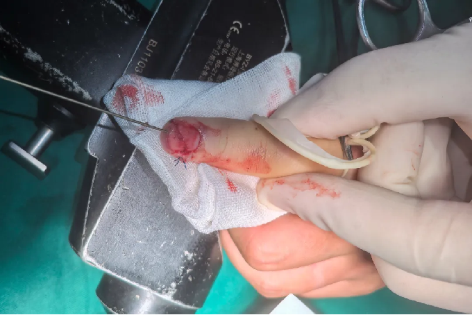 10月2日,一位患者因保护摔倒的儿子头部免受摔伤,导致自己手指被砸骨折、甲床断裂。骨二科副主任医师曹三利利用断指再植技术给予骨折固定、甲床缝合,恢复手指正常形态。