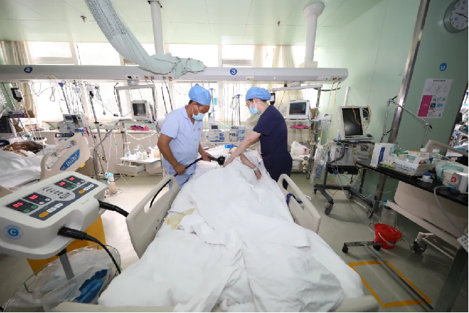 在重症监护室、血液透析室等处,医护人员们像往常一样悉心照料着患者,没有因为假期出现一丝疏漏。“患者生命安全第一”,在谨记这样的工作原则同时,医护人员们没有忘记给患者们送上一份诚挚的节日祝福和一份温暖的心理安慰。