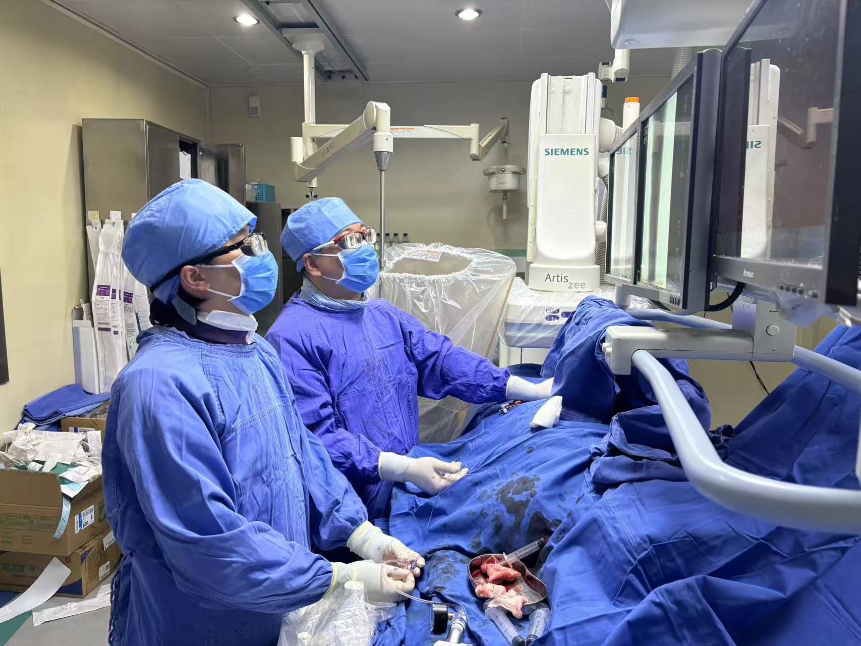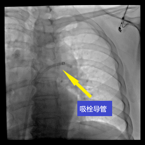 尽管李大妈的病情缓解了,但是叶钢主任在检查中发现李大妈的右心室已经增大,并且心肌酶明显增高,根据急性肺动脉栓塞的危险分层,属中高危阶段,李大妈的病情仍然比较危重,遗留远期肺动脉高压的可能性很大,遂向血管外科发出了会诊申请。经过综合评估,并与患者家属进行充分沟通后,血管外科赵亮主任决定为李大妈进行肺动脉造影及肺动脉血栓抽吸溶栓手术。这是目前一项比较先进的手术技术,通过微创介入,在患者的大腿根部静脉穿刺一个小孔,将一根细导管送到肺动脉内,连接负压吸引装置,将堵塞肺动脉的大块血栓抽吸出来,而通过导管注射小剂量的溶栓药,将会把残余的小血栓溶化,从而恢复肺动脉的血流供应,满足正常的气体交换。