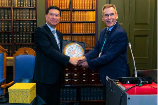 董家鸿(左)和Tim Mitchell于英国皇家外科学院互赠纪念礼物