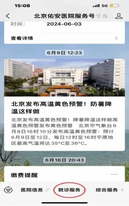 1.登录微信公众号“北京佑安医院服务号”,选择“就诊服务”。