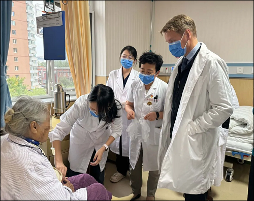 在病房组长主治医师苏日娜的具体介绍下,Gudjonsson教授及所有参与人员对皮肤性病与医学美容科在院所有患者进行细致地查房。住院医师张公杰及苏湘淅对病房患者病史进行汇报。过程中,双方医生就几例典型患者进行教学查房及讨论,包括红皮病型银屑病、大疱性类天疱疮等疑难病例。