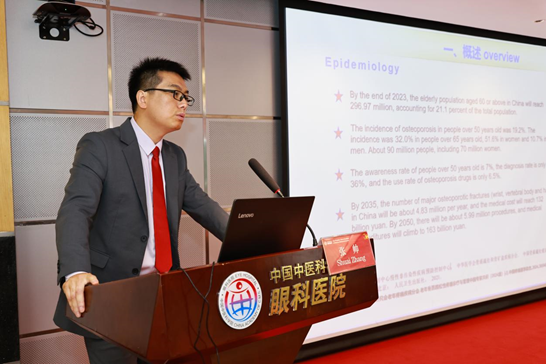 中国中医科学院眼科医院骨科副主任医师张帅介绍了中西医结合治疗老年性骨质疏松,强调早期预防及个体化、系统化治疗的重要性,并提出了眼科医院治疗方案。
