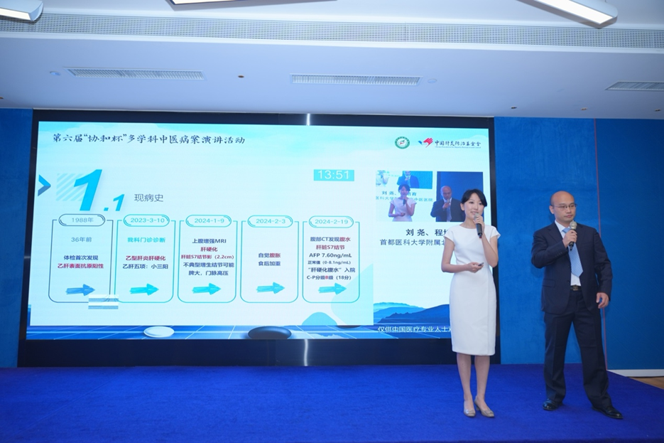 在决赛中,两位选手展示了一例复杂的乙肝肝硬化并伴有大量腹水的病例。该案例通过层层剖析,逐渐揭示了病情的真相。以患者突发“血性腹水”为关键线索,医疗团队迅速确诊“肝恶性肿瘤破裂出血”。面对这一紧急情况,肝病科与肿瘤科樊庆胜主任团队紧密合作,采取介入治疗,并将医院肝病大家关幼波教授、徐春军教授的宝贵学术思想融入到临床实践中,中西医结合,优势互补,共同帮助患者渡过难关,顺利出院。二位选手以生动而富有吸引力的方式呈现了这一病例,他们逻辑清晰、情感真挚的演讲深深打动了现场每一位专家和听众,赢得了广泛赞誉。