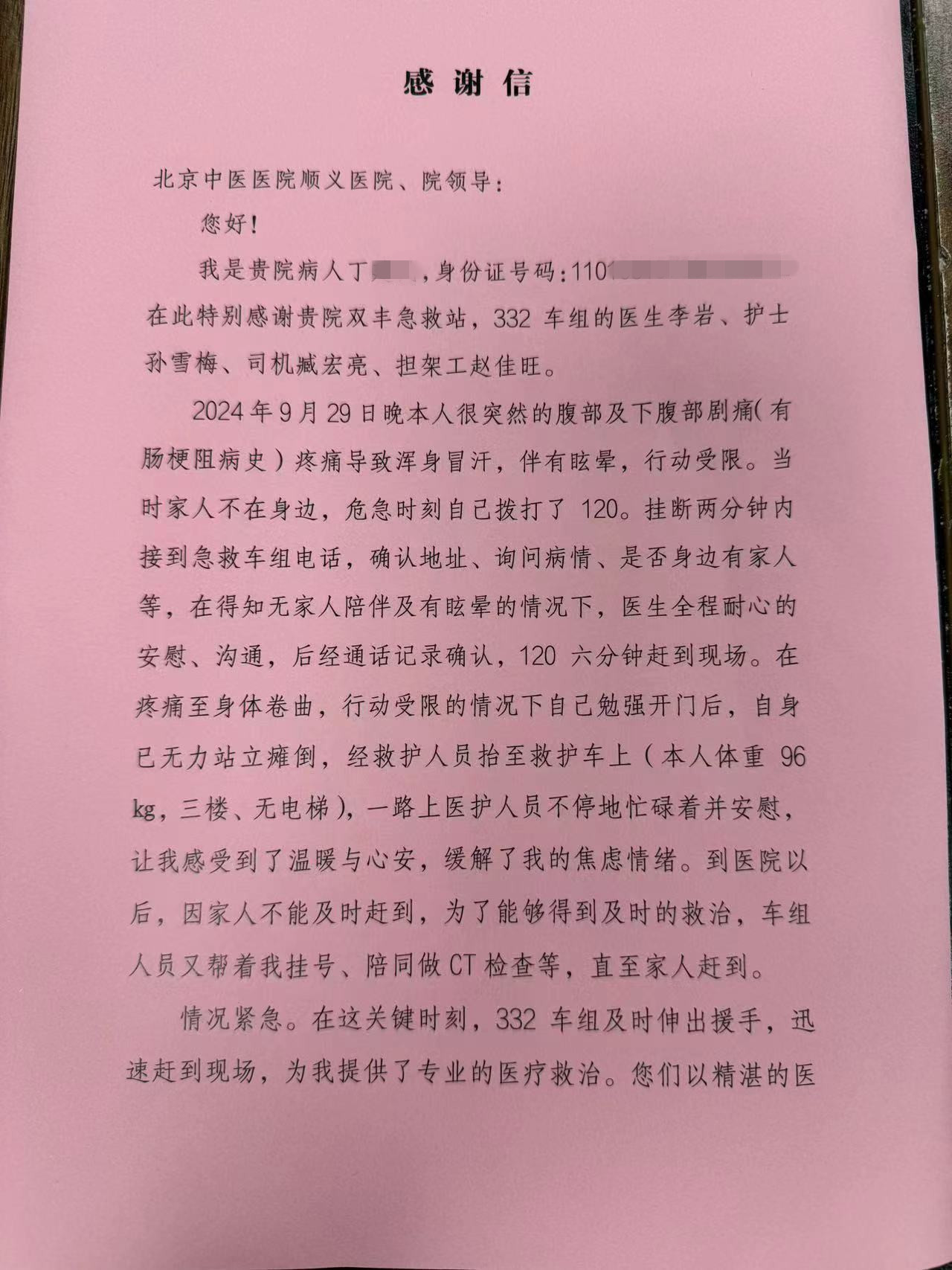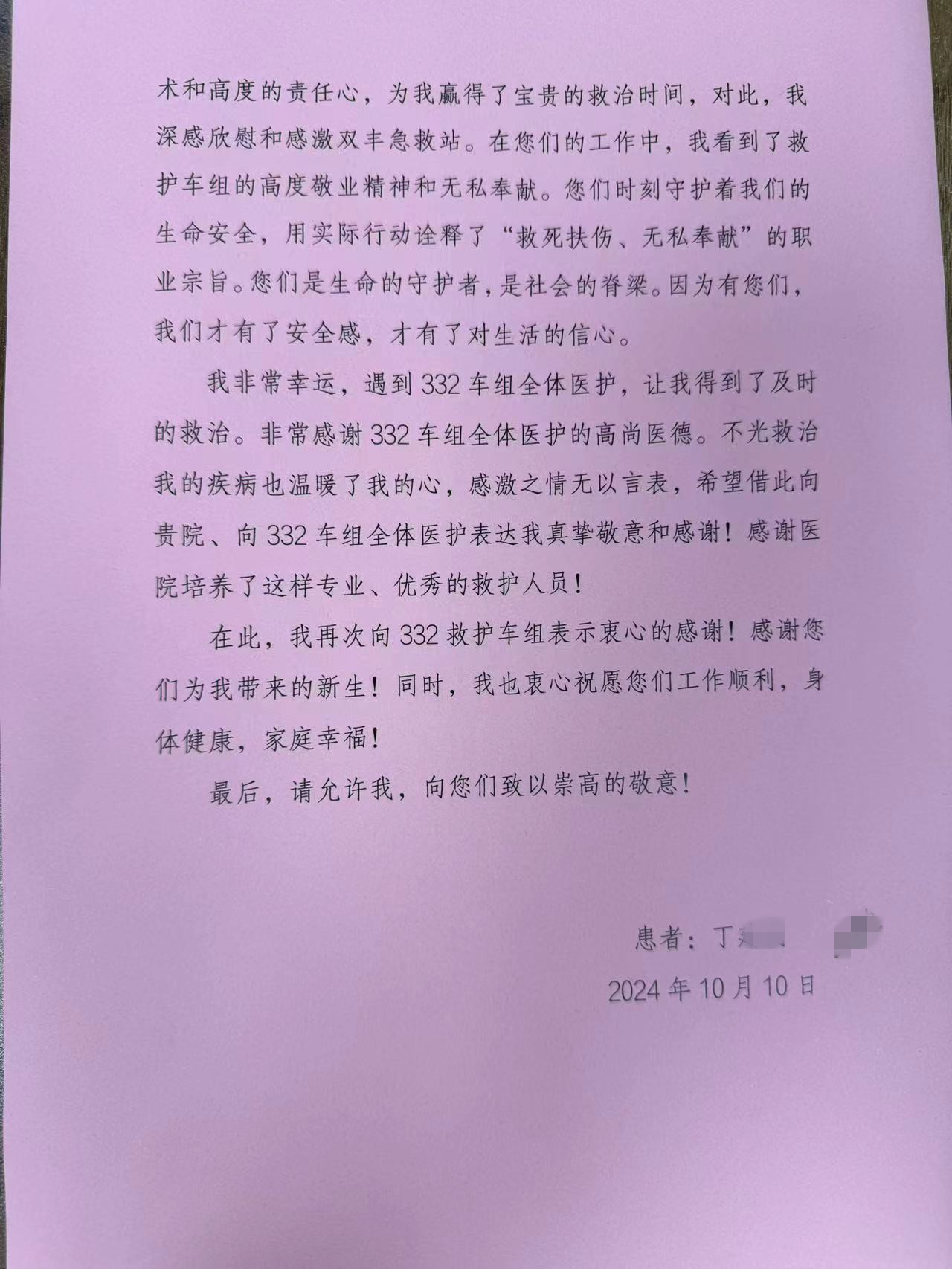 2024年10月11日上午,丁先生来到北京中医医院顺义医院,向120双丰急救站332车组送上一封满载感激之情的感谢信......