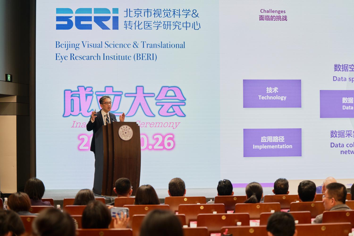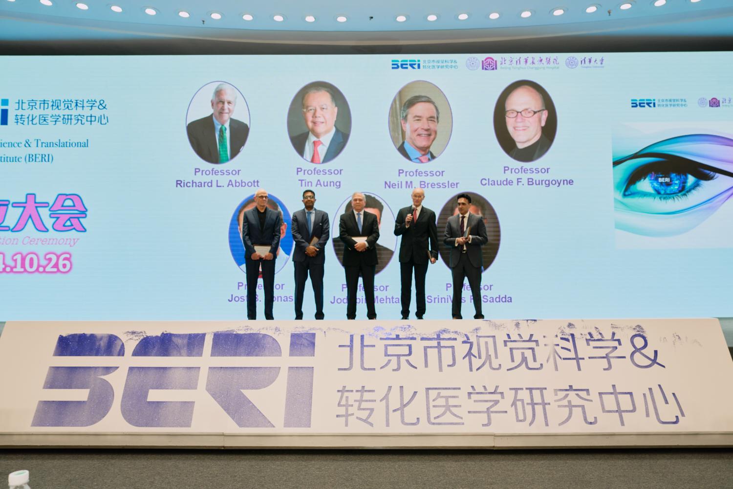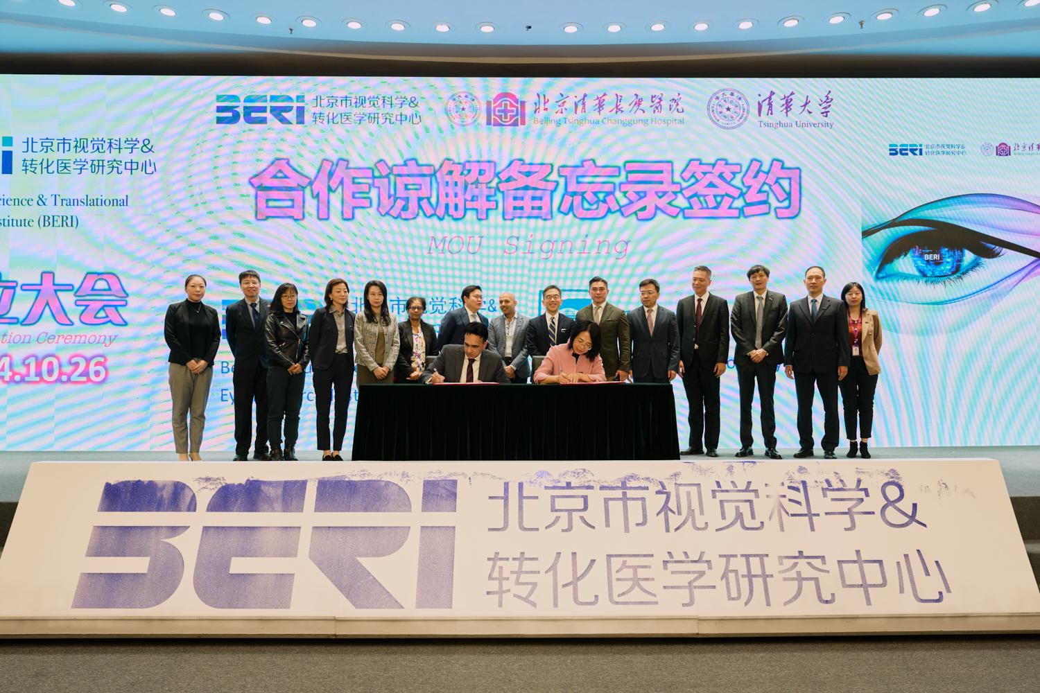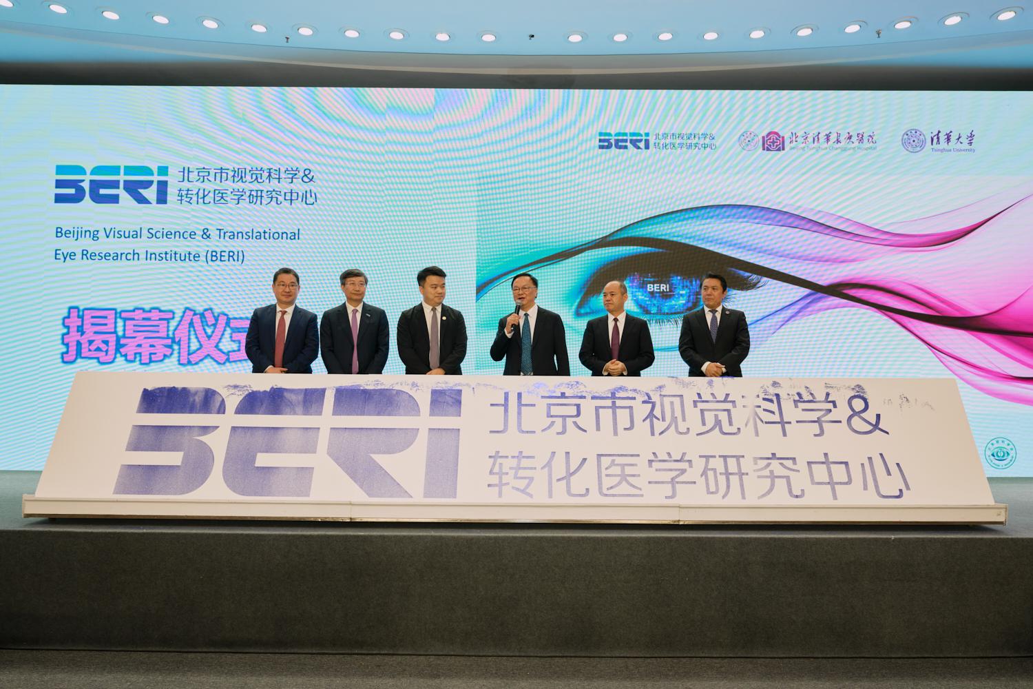 大会揭幕仪式、BERI介绍及授牌仪式,分别由BERI团队成员、清华大学长聘教授、清华长庚眼科专家张纯与长聘副教授王亚星主持;备忘录签订环节由北京清华工业开发研究院国际合作部主任钱景斌主持。北京市人才局副局长刘光毅,北京市财政局科技文化处,北京市卫生健康委员会干部人事处、人才处、财务处、科教处,北京市医管中心科教处负责人,清华大学信息学院院长、中国工程院院士戴琼海,四川省医学科学院、四川省人民医院院长、中国科学院院士杨正林,香港理工大学杰出创科学人计划讲席教授、视觉科学研究中心主任何明光,温州医科大学附属眼视光医院名誉院长、温州医科大学眼科医院集团理事长瞿佳,天津医科大学党委书记颜华,温州医科大学附属眼视光医院院长陈浩,北京同仁医院副院长、同仁眼科中心副主任、眼科学院副院长魏文斌,中山大学中山眼科医院院长林浩添,北京大学第一医院眼科中心主任杨柳,山西眼科医院院长李俊红,上海复旦大学眼耳鼻喉医院眼科研究院副院长、眼科副主任赵晨,学校科研院、国内合作版相关负责人,清华医学院和各附属医院相关部处负责人,以及业界内专家学者、师生代表莅临现场,共同见证并祝福BERI成立。BERI成立仪式后,国内外眼科知名专家还进行了广泛的学术交流。