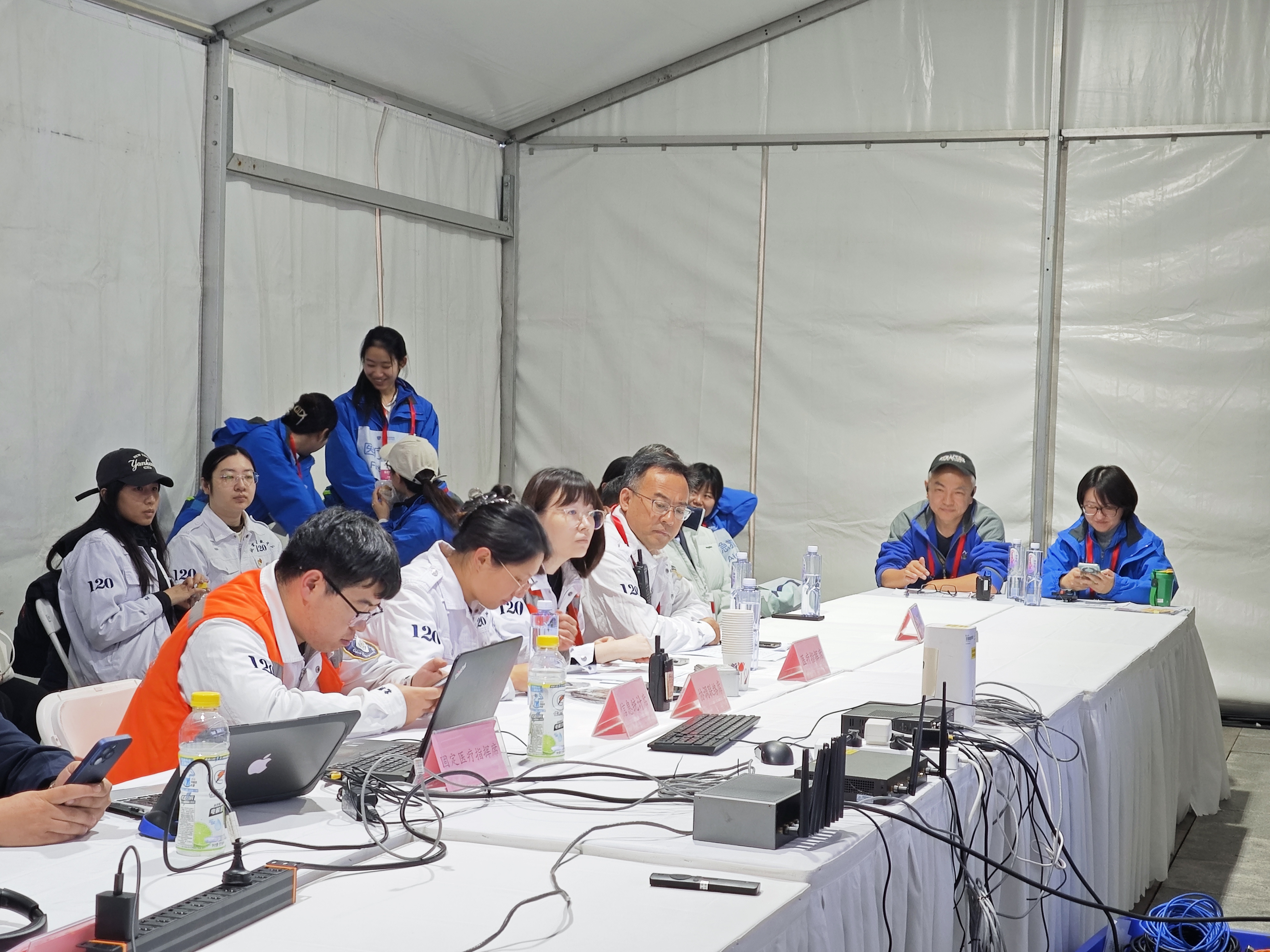 比赛当天,为充分发挥现场医疗指挥部的战斗堡垒作用,提高工作效率,中心医疗保障人员提前到岗做赛前准备,现场医疗指挥部设置医疗指挥席、技术保障席、协调联络席、信息统计席等,确保保障工作万无一失。