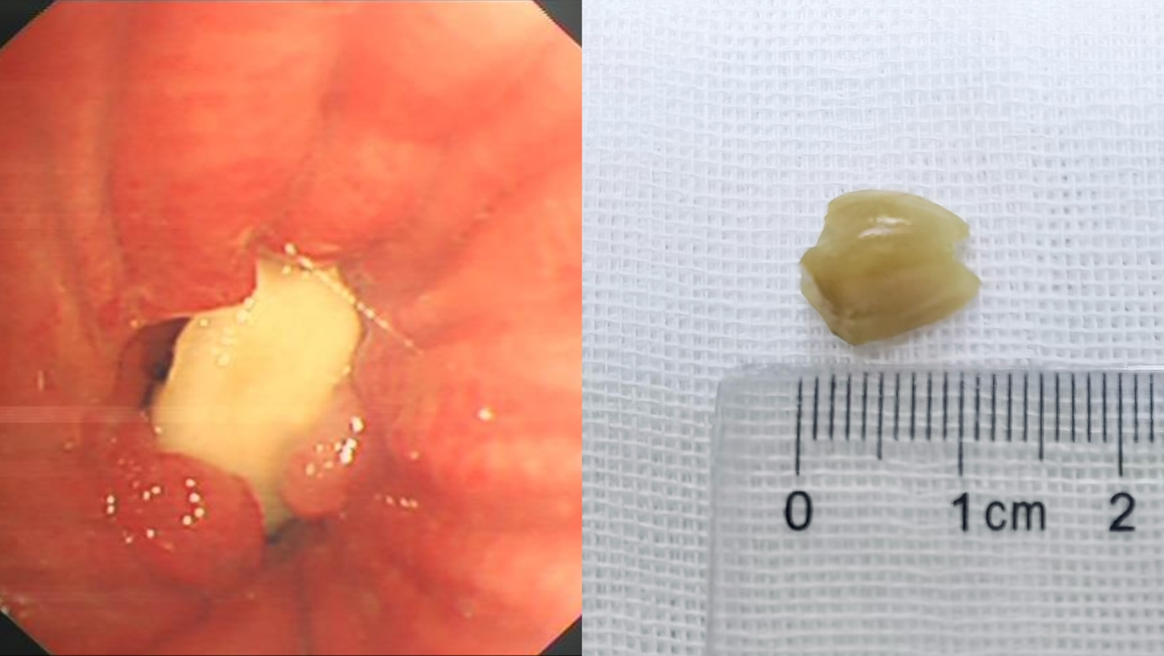 近日,愁眉苦脸的尹先生被家人搀扶着来到首都医科大学附属北京潞河医院呼吸科门诊就诊。经接诊医生仔细询问,原来65岁的尹先生近两年来反复出现干咳、喘息的症状,曾就诊于多家医院,被诊断为“肺炎”、“支气管炎”、“哮喘”,并接受了抗感染、雾化等治疗,但症状始终未见好转。近两个月来,尹先生的咳嗽症状愈发严重,夜间明显,影响睡眠,剧烈咳嗽时还伴有腹痛、背痛和气短,让他担心自己是不是患上了不治之症,焦虑、痛苦、失眠让他倍受折磨。在当地卫生院检查,尹先生再次被诊断为肺部感染,并接受了10天的输液治疗,但症状不仅没有缓解,反而愈发加重。近一周来,尹先生的咳嗽更加剧烈,并出现了咳嗽剧烈伴有晕厥,摔倒过3次。接诊医师立即给尹先生安排了肺部CT检查,结果显示“左肺下叶有斑片状高密度区,相应支气管局部狭窄,连续性差”,考虑患者影像有炎症改变,将尹先生收入院。主治医生杨开元给尹先生紧急安排了气管镜检查,在支气管镜下可见左肺下叶内前基底段开口处有一白色物质,几近完全阻塞管腔,周围伴肉芽组织增生,管腔远端间断溢出脓性分泌物,使用活检钳抓取困难,患者咳嗽剧烈。通过医生进一步详细询问病史,了解到尹先生常因低血糖而进食匆忙,并在进食时常分心,如玩手机、看电视甚至唱歌,导致过多次呛咳。于是呼吸内镜团队对尹先生进行了全面评估,考虑气道异物可能性很大,经过与患者及其家属的充分沟通,决定由经验丰富的邢振川主治医师进行电子支气管镜下取异物治疗。