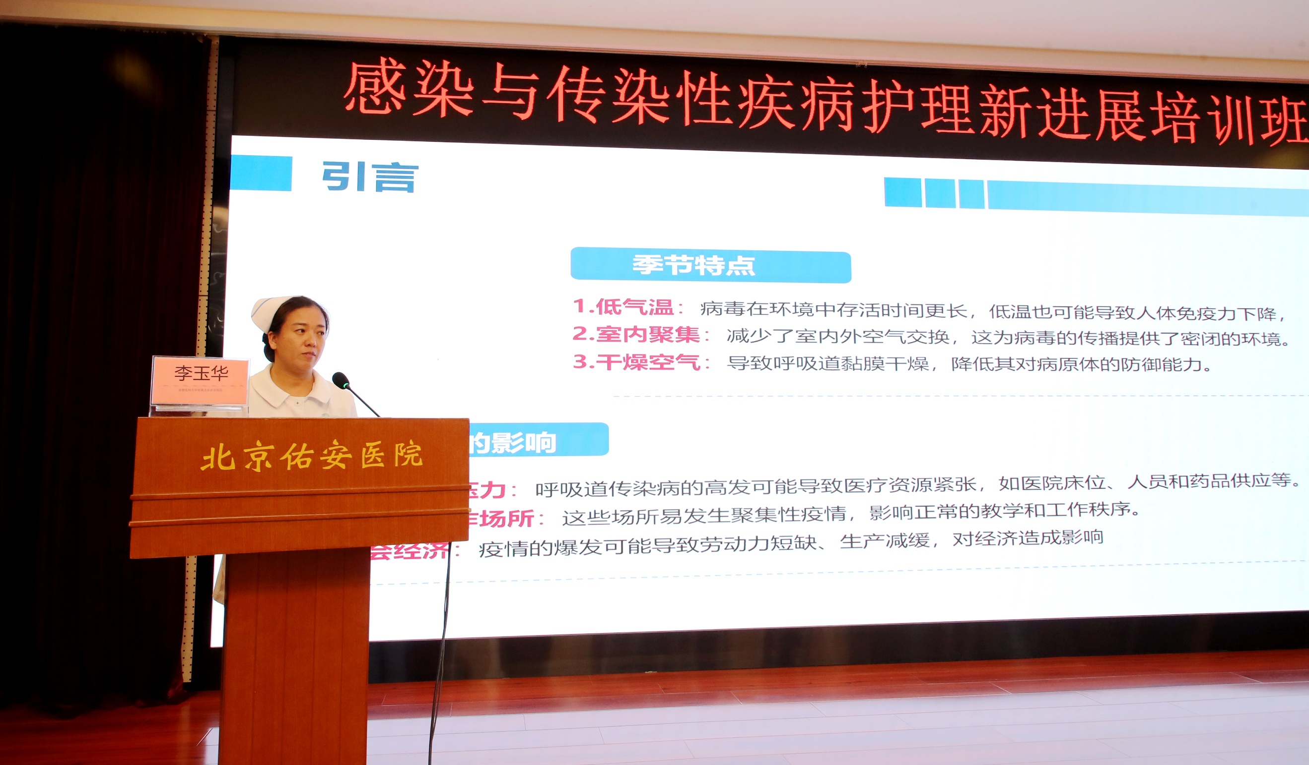 北京护理学会李春燕秘书长对培训班承办方北京佑安医院精心筹备表示感谢,对所有参会代表表示欢迎,对全区传染病护理工作者表示肯定,并指出自疫情以来传染性疾病的诊疗特点给专科护理提出了更大的需求和挑战,希望大家深耕细作,为传染护理事业发展做出贡献。随后李春燕秘书长围绕“专业发展提升护理质量”这一主题进行精彩授课。