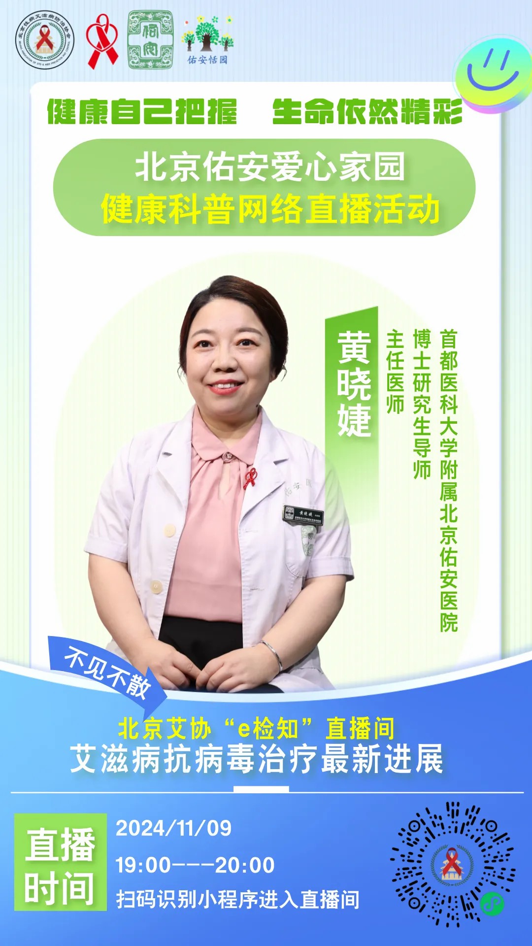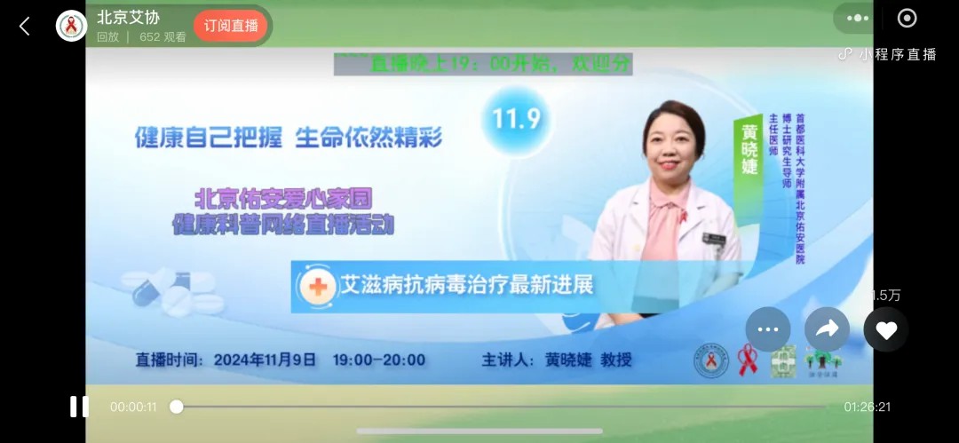 2024年12月1日是第37个“世界艾滋病日”。我国今年宣传活动主题为“社会共治,终结艾滋,共享健康”。为了更好地帮助HIV感染者应对疾病,提高生活质量,北京佑安爱心家园、北京性病艾滋病防治协会、艾滋病健康基金会、爱心家园恬园工作室联合开展了《健康自己把握 生命依然精彩》网络系列直播活动。2024年11月9日一场意义非凡的抗病毒治疗网络培训活动拉开帷幕。北京性病艾滋病防治协会福燕副会长、北京佑安医院感染与免疫医学科黄晓婕主任医师、北京佑安爱心家园李冬梅副秘书长、爱心家园恬园工作室负责人段君义及部分志愿者参与了此次活动,共600余位感染者通过北京艾协“e检知”直播间收听和观看。