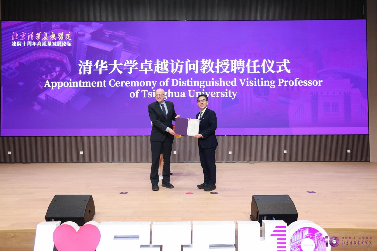 黄天荫(右)为国际知名医学教育专家与医学人文教育家约瑟夫·唐纳德·布德罗(Joseph Donald Boudreau)教授颁发清华大学卓越访问教授,指导清华医学教育-课程改革工作。