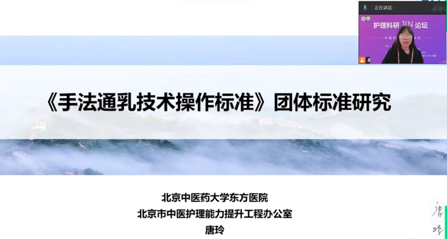 北京中医药大学东方医院护理部主任、JIN主编唐玲教授以“《手法通乳技术操作标准》团体标准研究”为题进行专题讲座。首先介绍了JIN期刊的发展现状,随后深入剖析了手法通乳技术操作标准制定的背景与重要性,以及编制的关键环节,展示了团体标准规范的编制方法,为与会者提供了宝贵的学术指导,对中医护理技术操作标准的制定有了更深刻的认识。