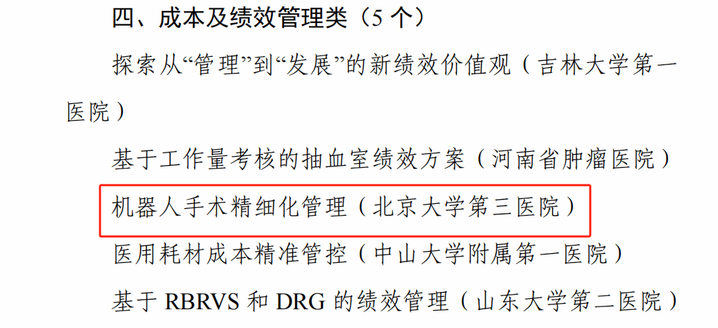 2024年11月15日,国家卫生健康委、国家中医药局发布《关于印发公立医院运营管理业财融合典型案例名单的通知》。北京大学第三医院医院运营管理处提交的《机器人手术精细化管理》案例入选公立医院运营管理业财融合典型案例-成本及绩效管理类典型案例。