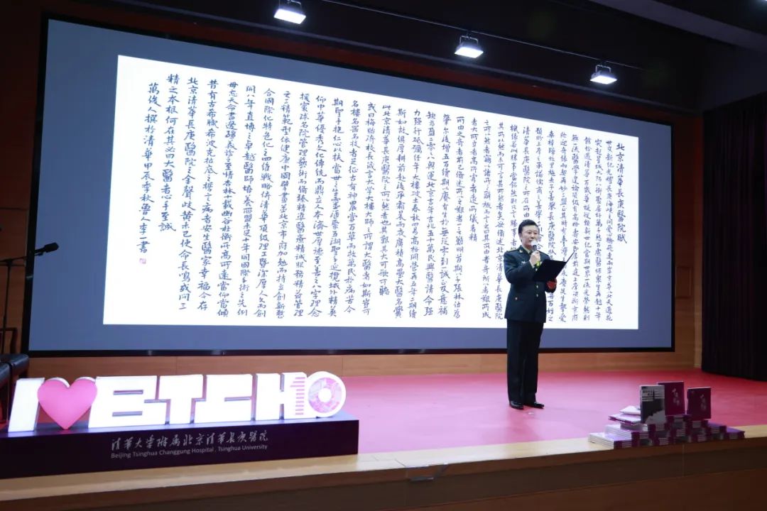 伴随着悠扬而深情的音乐,特邀嘉宾、军旅主持人、演员、全军首届舞台主持艺术大赛金奖得主苗博,以其深情且有力的嗓音朗诵《北京清华长庚医院赋》,拉开了十周年纪念文集发布活动暨《髓海风劲一帆扬》读书会的序幕。