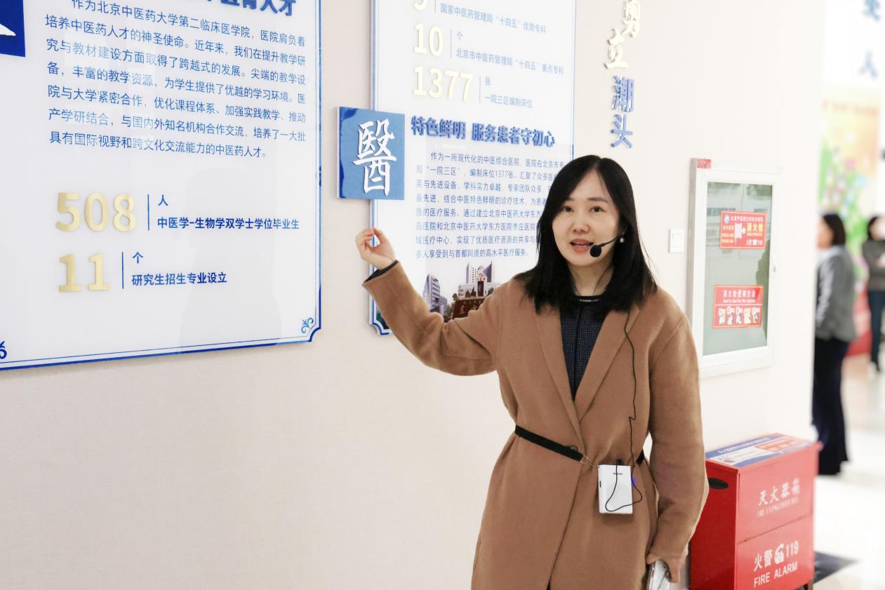紧接着,宣传科刘雨涵老师接棒,她以其专业的解说技巧,生动描绘了医院“一院三区两中心”的发展蓝图,带领大家共同回顾了医院历史发展轨迹和取得的卓越成就。在一层数字博物馆互动屏前,她引导来宾们通过触摸屏感受中医药与现代科技的完美融合,让传统文化焕发新生。