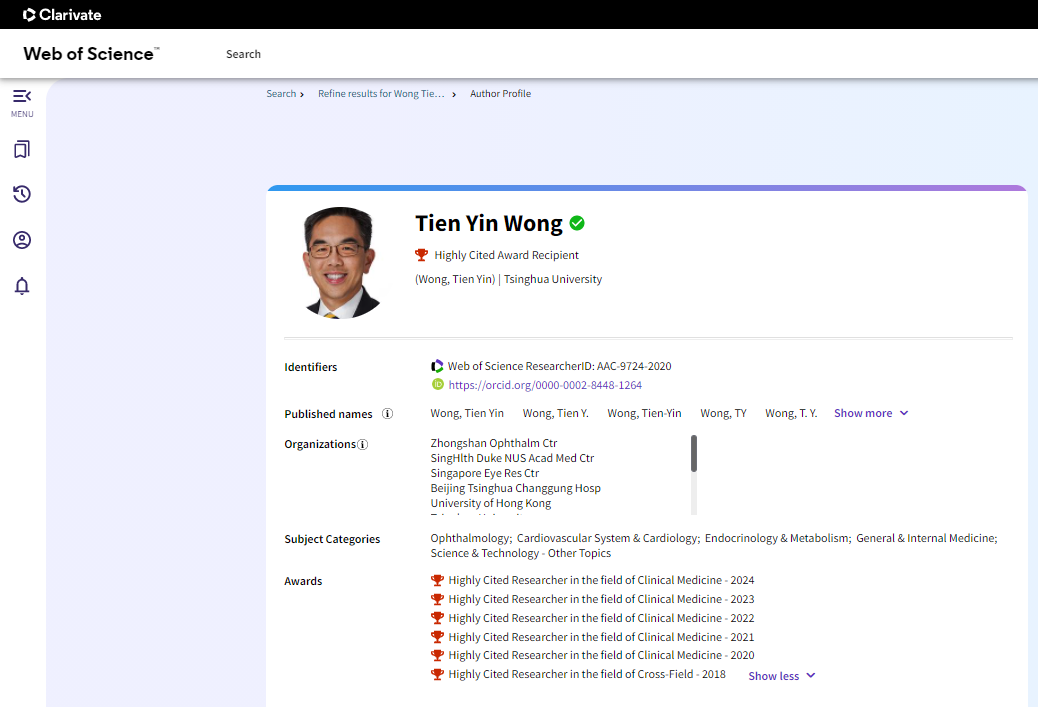 作为临床视网膜专家,黄教授致力于视网膜疾病、眼部成像、人工智能和数字技术的研究和创新。其发表同行评议论文逾1500篇(h-index为214);国际受邀讲学500余次(大会报告、研讨会等);获科研资助超1亿美元。因在眼科研究领域的卓越贡献,黄教授屡获国际奖项与殊荣,如美国黄斑协会阿纳尔·帕茨奖章(Arnall Patz Medal of Macula Society)、亚太眼科学会(APAO)Jose Rizal奖章、美国眼科学与视觉科学协会(ARVO)Friedenwald奖章。黄教授曾获得新加坡总统科学技术奖。黄教授是新加坡国家科学院院士、美国国家医学科学院外籍院士、澳大利亚健康与医学科学院外籍院士。2024年,黄教授荣获北京市第16届长城友谊奖。