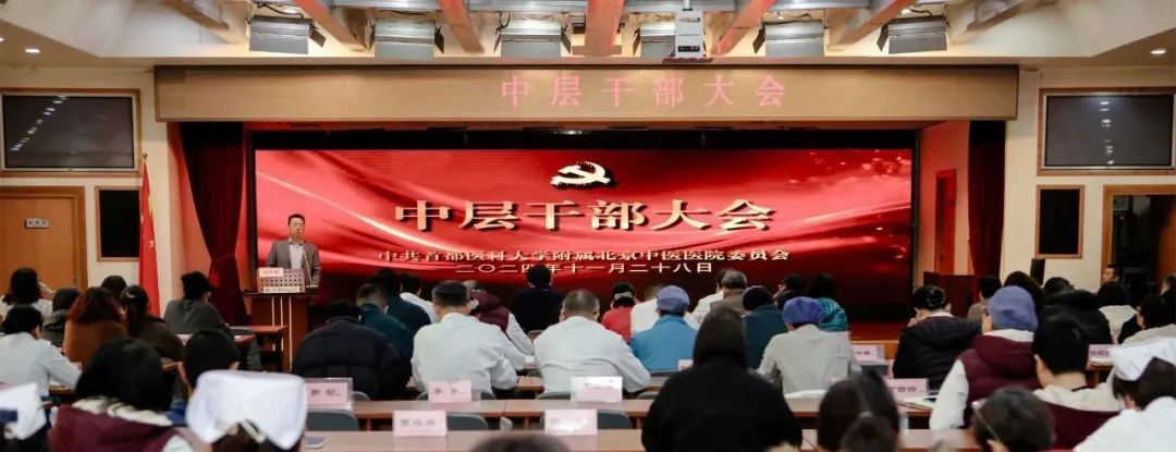 为深入贯彻党的二十大和二十届三中全会精神,扎实践行党管干部要求,深切领会习近平总书记关于党的建设的重要思想,优化医院职能科室中层干部队伍,提升全院运营管理效能,推动医院实现高质量发展,持续为民众提供优质医疗服务。11月28日,首都医科大学附属北京中医医院党委组织召开全院中层干部大会。医院领导班子成员、全体中层干部、党支部书记共百余人参会。会议由党委副书记、纪委书记程军主持。