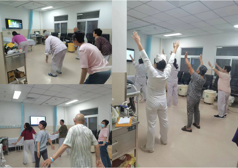 在治疗之余,刘大爷还喜欢跟随我院内分泌科护士学习八段锦。八段锦是我国由来已久的气功保健方法,有柔筋健骨、益气活血、舒筋活络、协调五脏六腑的功能,非常适用于不能有效配合运动的老年糖尿病患者,在病区很受患者喜爱。专科护士定时带领住院患者跟随视频做八段锦和调糖操,提高了患者良好的住院就医体验。