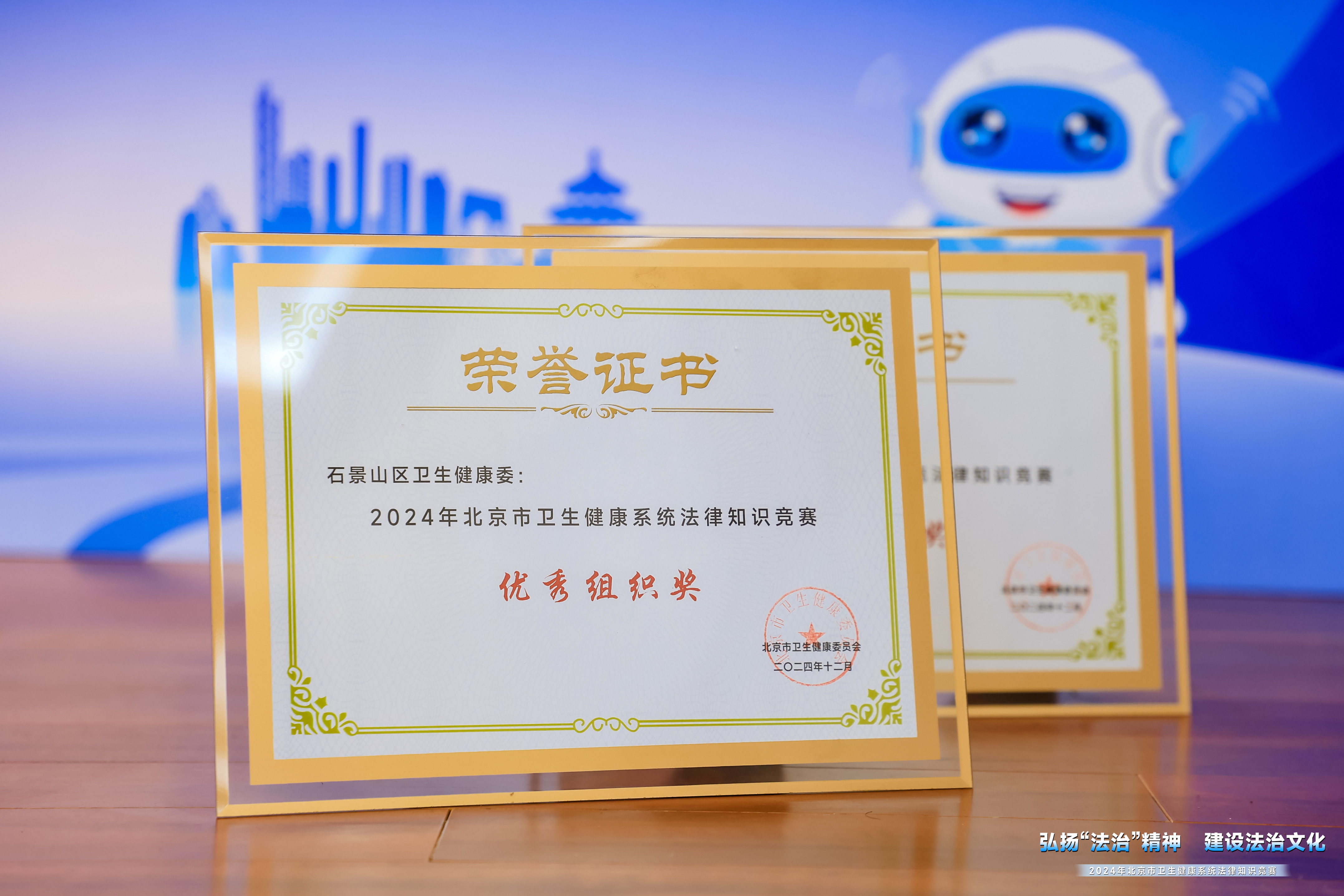 12月3日,石景山区代表队参加了市卫生健康委组织的2024年北京市卫生健康系统法律知识竞赛决赛,并取得三等奖的好成绩。同时由于我委积极参与赛事,多层次对宪法及相关法律进行全方位宣传,得到了市卫生健康委的高度认可,被授予“2024年北京卫生健康系统法律知识竞赛优秀组织奖”的光荣称号。