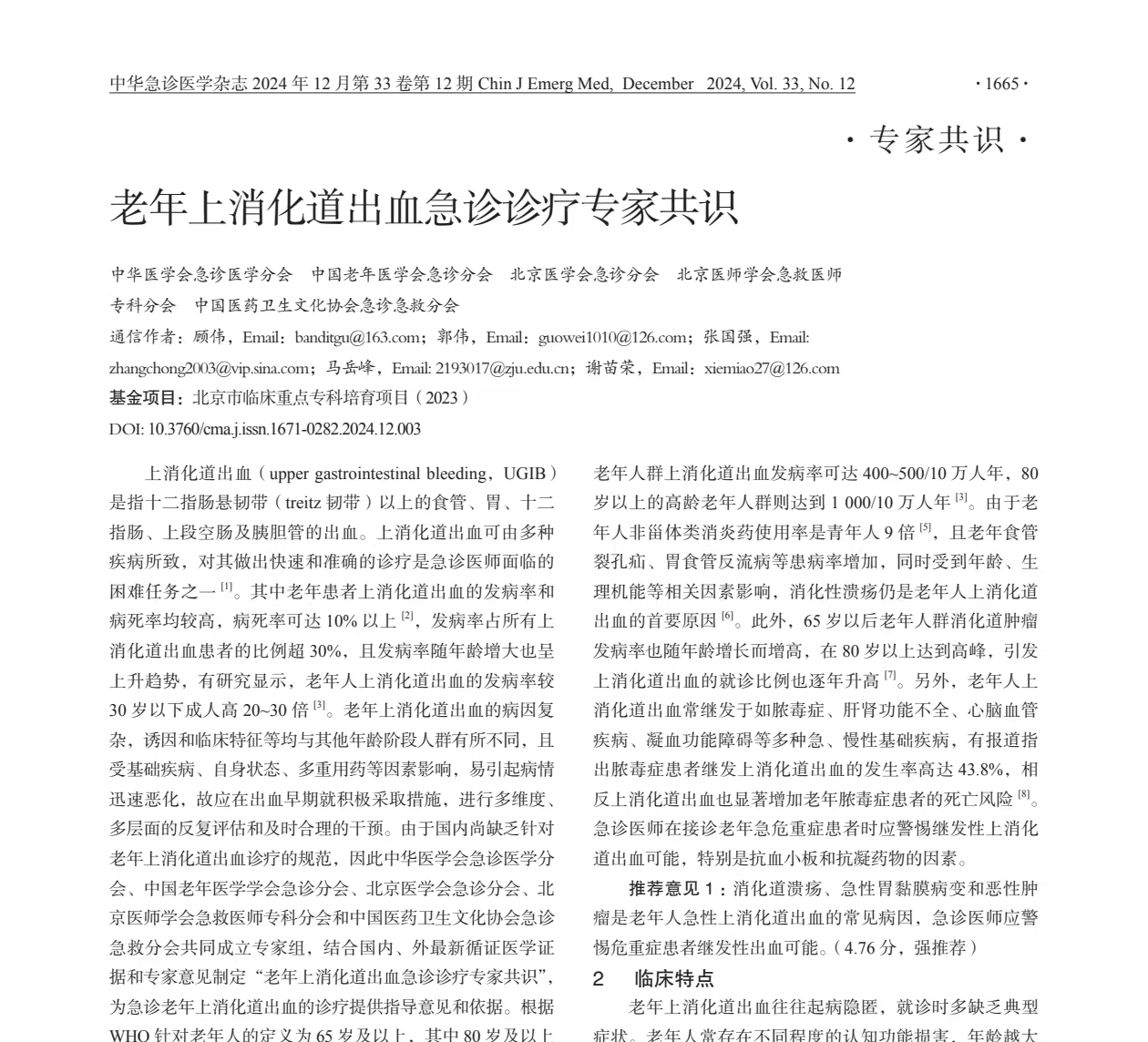 近日,由清华大学附属垂杨柳医院急诊医学科主任顾伟作为共同通讯作者和执笔者之一,撰写的《老年上消化道出血急诊诊疗专家共识》于本月在《中华急诊医学杂志》《中国急救医学》和《临床急诊杂志》同步发表。