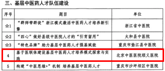 北京中医医院顺义医院自2013年被首都医科大学附属北京中医医院托管以来,在刘清泉总院长“管理同道、医疗同质、学科同根、文化同源”理念的指引下,秉承“仁、术、勤、和”的办院理念,医院在医、教、研、管、人才培养等方面实现全面提升,中医药特色优势显著增强。医院采取分层分类培养策略,针对临床型、科研型、教学型、复合型中医人才制定个性化培养方案,强化临床实践、科研平台支持、教学技能培训及跨学科培养。同时,通过专科建设、科研体系、学科共建及四级中医师承体系等平台搭建,完善中医人才培养体系。通过倾心引才、精心育才、真心留才等政策,“人才高地”逐渐形成,人才培养成效显著,科研与教学成果丰硕,师资队伍不断壮大,四级中医传承体系逐步健全,高级别课题立项增多,医院核心竞争力不断提升。自托管以来,立项国家级人才项目7项、省部级及市级人才项目15项。目前拥有北京市基层中医药学科团队基地2个,北京中医医院-北京中医医院顺义医院两院共建重点学科6个,院级重点学科4个。医院独立立项国家自然科学基金面上项目1项、青年项目9项,为北京市郊区中唯一连续七年获得国家自然科学基金项目立项的单位;独立立项北京市自然科学基金面上项目2项、青年项目2项,立项省部级课题12项。获得省部级、区级、院级科技成果奖13项,包括2015、2016年连续获得中华中医药学会科学技术奖政策研究奖。获得实用新型专利授权63项。医院已建立全国名老中医药专家传承工作室2个、全国基层名老中医药专家传承工作室3个、北京中医药薪火传承“3+3”工程基层老中医传承工作室6个,各级名医传承工作室及分室站达28个;拥有全国老中医药专家学术经验继承工作指导老师2人,首都国医名师2人,北京市中医药专家学术经验继承工作指导老师3人,顺义区名老中医药专家学术经验继承工作指导老师7人,院级名中医师带徒项目指导老师11人。