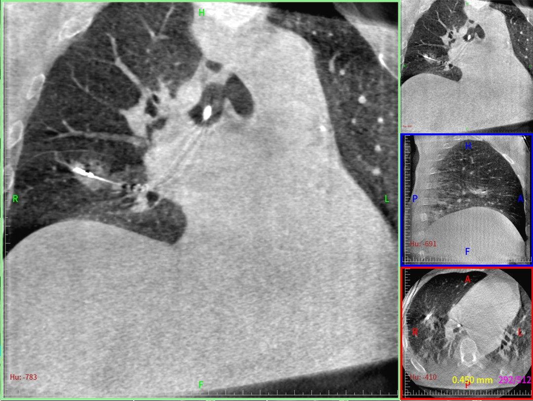 王峰教授凭借丰富的手术经验,术前为患者制定了详细的柔性导航支气管镜机器人系统协同冷冻消融的治疗方案。术中,O臂CT精准定位病灶,全程监测导管位置与冷冻消融区域。在导航支气管镜机器人系统三维实景的“指引”下,王峰教授沉稳地操控手柄,驱动支气管镜机器人精准到达右肺中叶的目标病灶。现场细胞学检测发现了高度疑诊腺癌的异常细胞。活检完成后,通过支气管镜机器人系统置入冷冻消融探针,借助O臂CT再次校准,随后启动消融治疗。消融范围完美覆盖了病灶,整个手术过程无出血、气胸等并发症发生,取得圆满成功。