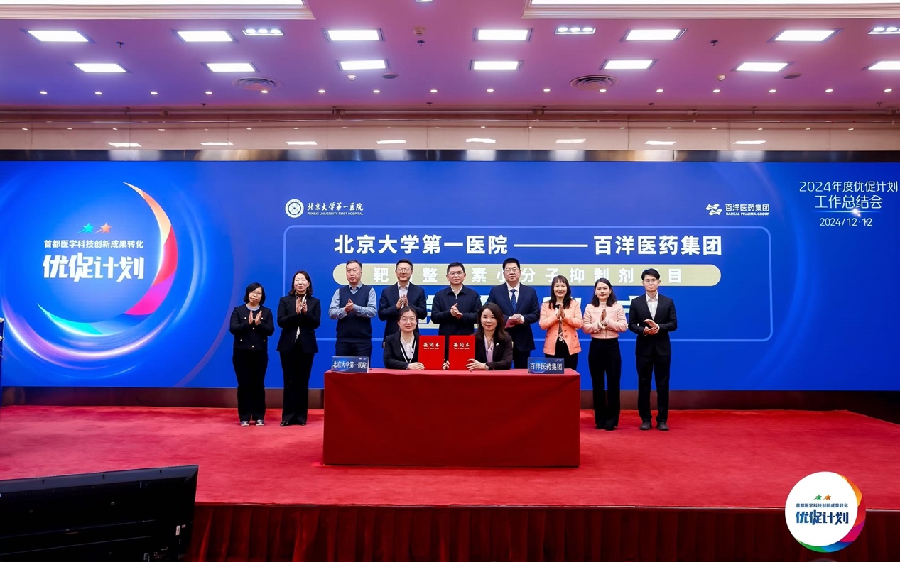 12月12日,由北京市卫生健康委主办、北京市医药卫生科促中心承办的2024年度“首都医学科技创新成果转化优促计划”工作总结会成功举办。会上,北京大学第一医院与百洋医药集团签署了关于“靶向整合素小分子抑制剂项目”的合作协议。北京市卫生健康委员会党委书记钟东波,北京市医药卫生科技促进中心主任张静波,北大医院副院长李建平,百洋医药集团有限公司董事、总裁宋青等嘉宾出席签约仪式。