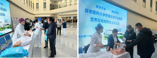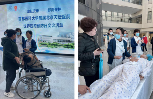 随着人口老龄化的日益加重,压疮的发病率也随之增高,由此带来了沉重的社会家庭负担。压疮已经成为全球医疗机构共同面临的难题,严重影响着患者的生活质量。为了使更多的人了解、关注压疮,掌握专业压疮的防治知识,有效地预防压疮的发生,2024年11月21日在第十二届“世界压疮预防日”来临之际,天坛医院护理部联合医院伤口护理小组在门诊楼大厅举行“皮肤安康,即刻守护”义诊活动,为相关患者及家属提供专业前沿健康教育知识。伤口专家和伤口治疗师们耐心细致的为患者及家属进行义诊咨询,答疑解惑。