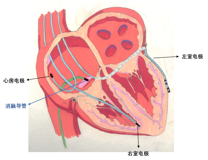 它是由两个手术组成,一个是起搏器植入术,包括普通双腔、CRT(三腔)起搏器的植入。另一个手术是消融房室结(或房室交界区),目的是阻断房室之间的电连接,从而令快速紊乱的房性心律不影响心室的收缩。