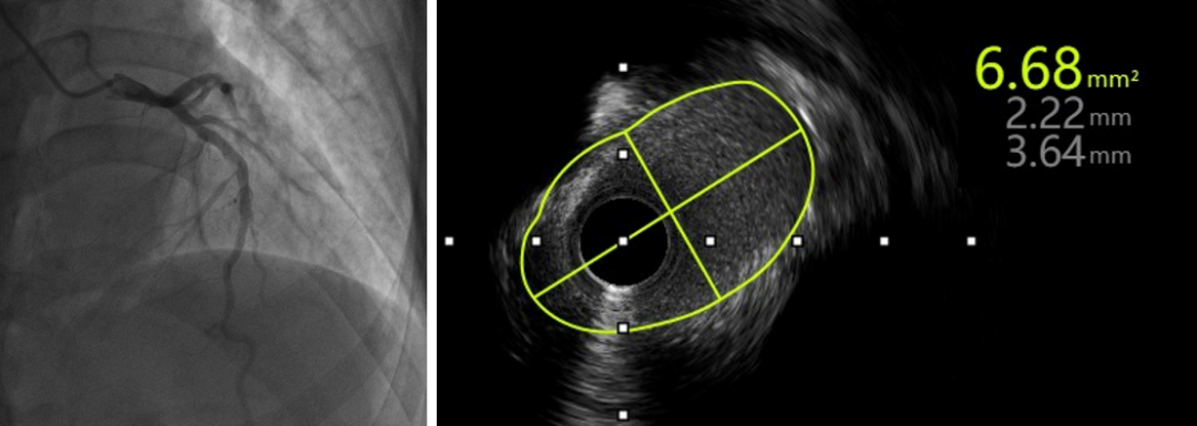 考虑到钙化结节仍较大,钙化环未充分打开,为彻底解决患者的血管病变,崔永亮医师再次穿刺股动脉,经8F指引导管送入2.25mm旋磨头,再次对前降支病变由14万转降速至10万转对病变反复打磨抛光。根据以往经验,透析患者极易反复发生支架内再狭窄的问题,结合IVUS复查结果,崔永亮医师决定采用4.0×30mm药物球囊进一步处理病变,以达到“介入无植入”的效果。术后IVUS显示钙化结节少量残留,管腔面积增大一倍有余上,达6.68mm²,堪称效果完美。