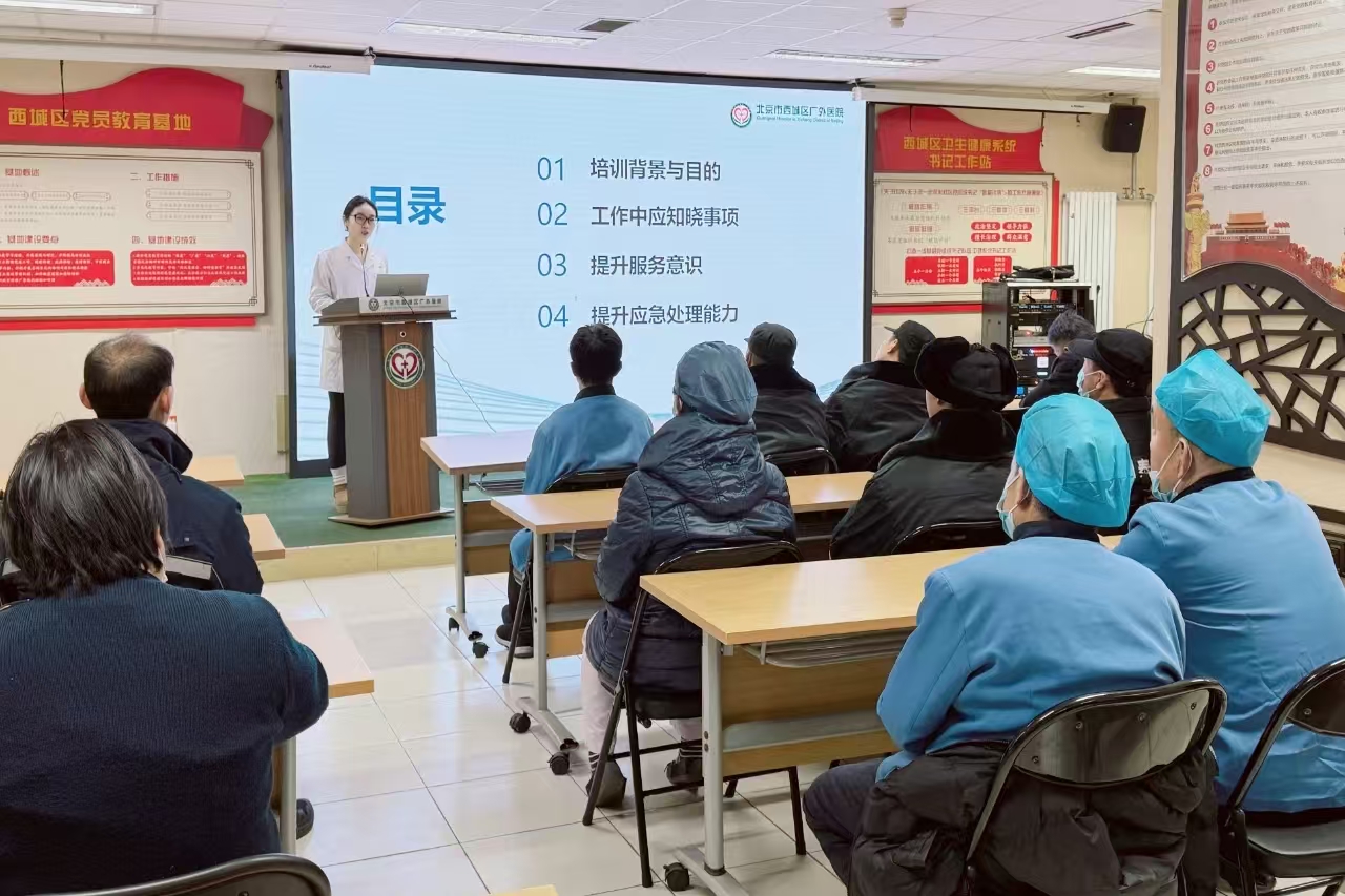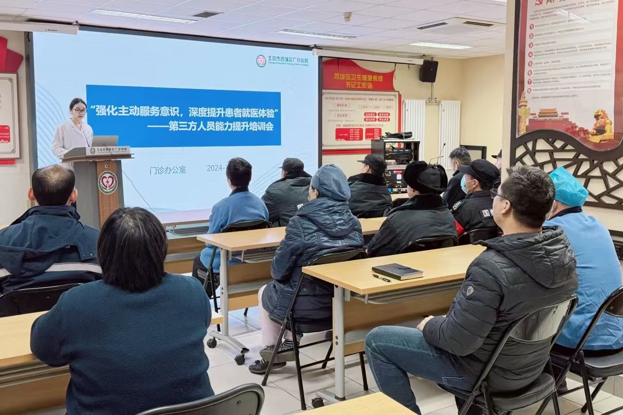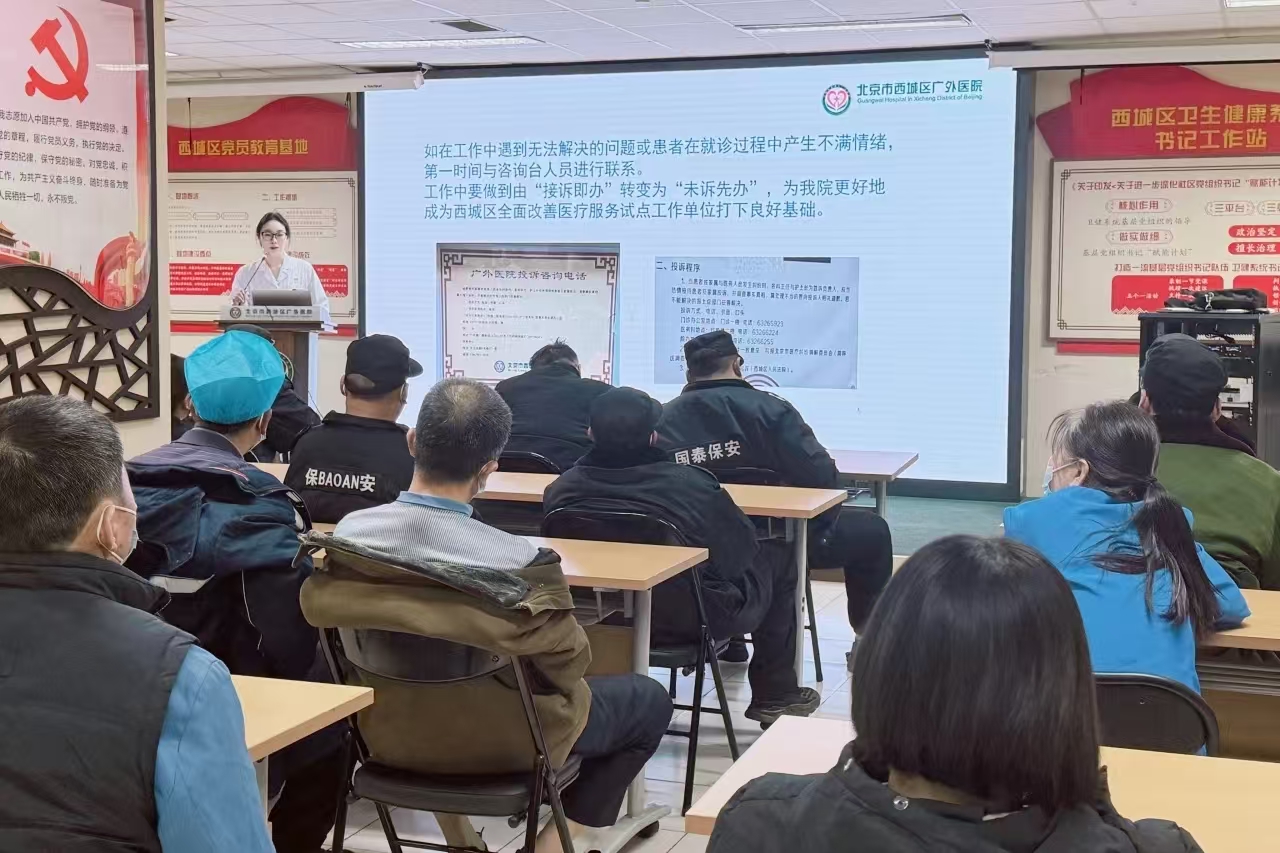 近日,广外医院门诊办公室举办第三方服务人员专题培训,提升综合服务能力,向群众提供优质、安全、满意的医疗服务,进一步改善患者就医体验,全院保洁员、保安员、护工人员共计30余人参加。这也是广外医院作为西城区全面改善医疗服务试点工作单位以来组织的系列培训之一,旨在促进医疗服务流程优化创新,全面提升医疗服务水平。