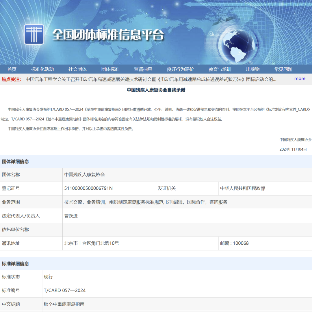 近日,由北京清华长庚医院牵头单位起草的《脑卒中重症康复指南》(T/CARD 057-2024)团体标准由中国残疾人康复协会正式发布和实施。