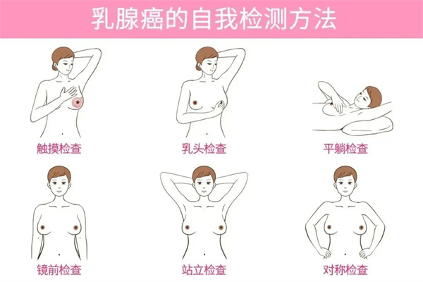女性最好在月经结束后7-10天自我检查,用中指和食指的指腹以敲击方式触摸整个乳房,轻轻地触摸皮肤下的任何肿块或变化。触诊后可以对照镜子,检查两个乳房是否有形状或轮廓的任何改变,包括乳头溢液、凹陷或乳房皮肤是否凹陷、水肿、发红等。