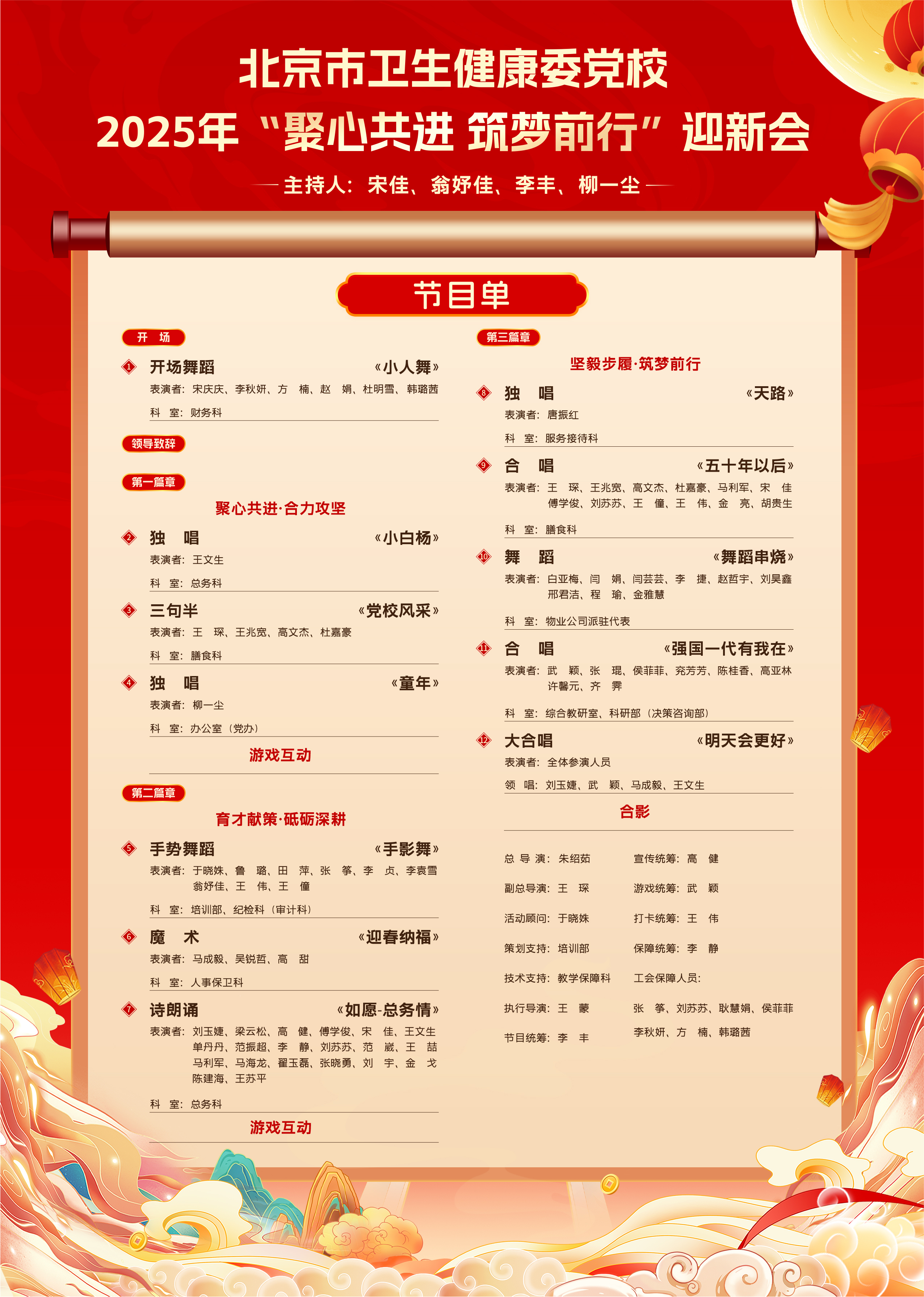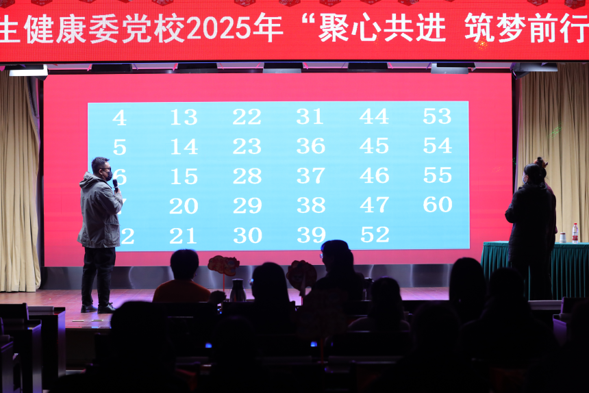 欢声笑语辞旧岁,踏歌起舞迎新春。为迎接2025年新春佳节的到来,进一步搭建职工交流平台、丰富职工文化生活,展现职工积极向上的精神风貌、激发职工干事创业的热情活力,近日,北京市卫生健康委党校2025年“聚心共进、筑梦前行”迎新会在党校报告厅成功举办,全校教职工及物业派驻员工齐聚一堂,喜迎新春、共谋发展。