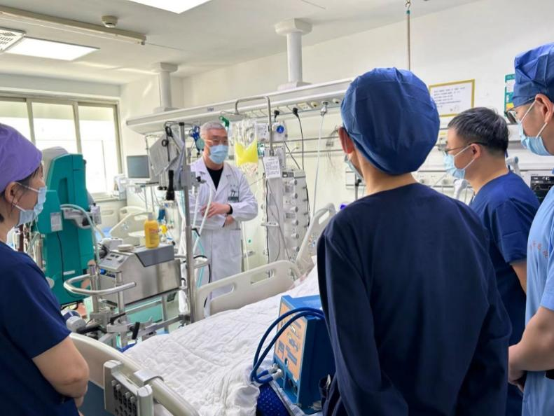 图一:栗光明主任、王鑫副主任查看肝移植术后ECMO支持危重症患者治疗情况。
