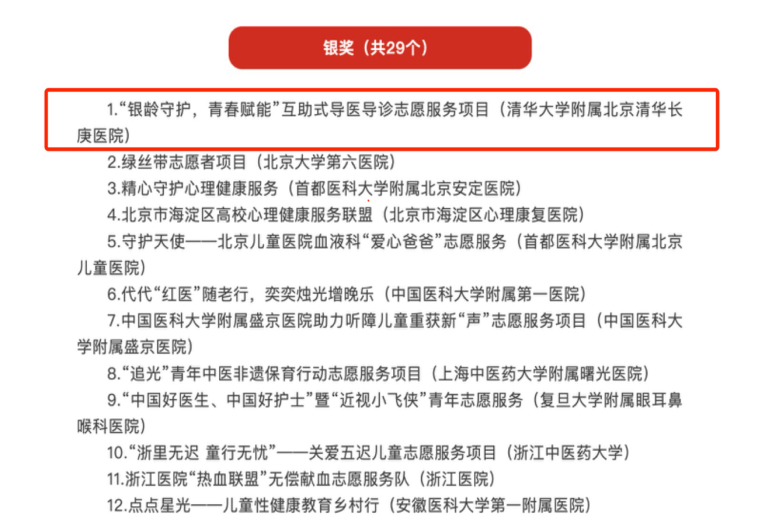 经过省级推荐、资格审核、全国赛初评、决赛评审、社会公示,北京清华长庚医院申报的“银龄守护,青春赋能”互助式导医导诊志愿服务项目荣获“第四届全国卫生健康行业青年志愿服务项目大赛银奖”、“第七届中国青年志愿服务项目大赛铜奖”两项国家级赛事荣誉。