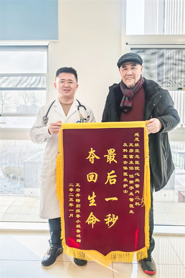 1月27日,在乙巳蛇年新春佳节到来之际,患者鲁先生将“最后一秒夺回生命”锦旗送到航空总医院心血管内科二病区王彦富手中,感谢团队救命之恩并为医务人员送上新春祝福。